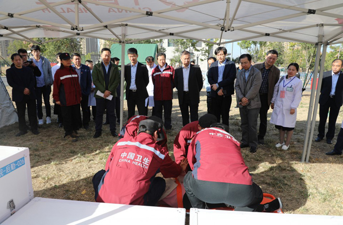 评估当天上午,国家卫生健康委卫生应急办公室综合协调处相关负责人,同四川大学华西医院副院长黄进任组长的评估专家组一行,前往一附院东区演练营地,实地详细查看了帐篷医院布局、物资装备配置、标志标识规范、人机结合情况、模拟SP救援流程。随后,专家们在院本部对检查项目管理制度及落实情况、操作规程、培训演练方案计划等项目建设资料进行检查,并就关键问题现场提问核查。