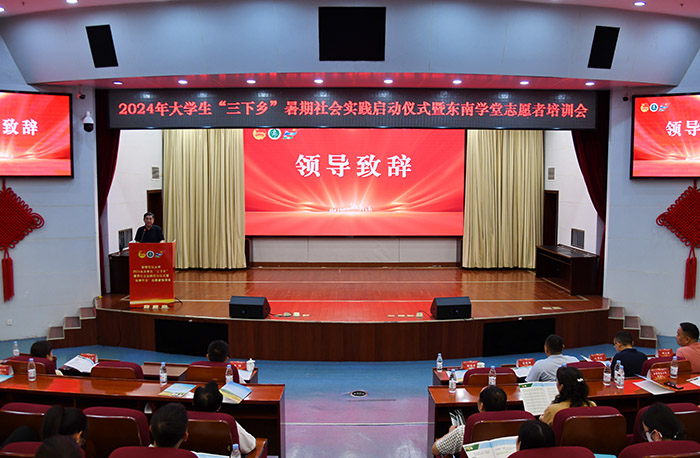 7月5日,我校2024年大学生“三下乡”暑期社会实践启动仪式暨“东南学堂”志愿者培训会在图书馆第一学术报告厅举办。校党委书记王琦出席仪式,并为校院重点团队代表授旗,标志着我校暑期社会实践活动正式启动。校党委副书记、第一附属医院党委书记谢瑞瑾出席启动仪式并为志愿者授课。