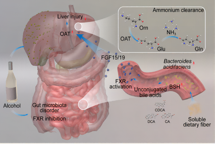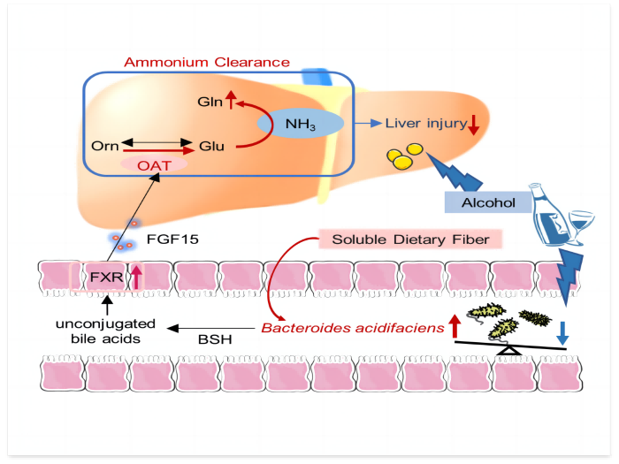 此项研究为倡导合理饮食结构、纠正膳食纤维均摄入不足现状,以通过肠道微生物发挥控制或治疗ALD的效果提供了理论依据。研究同时明确了B.acidifaciens通过表达胆盐水解酶调节小鼠肠道胆汁酸谱,进而激活肠道 FXR 信号调节肝脏基因表达的调控机制,并发现OAT可以通过维持肝脏内谷氨酰胺合成减轻氨积累引起的毒性损害,提出降低肝脏内氨的蓄积可能是治疗急性酒精性肝损伤的有效方式。