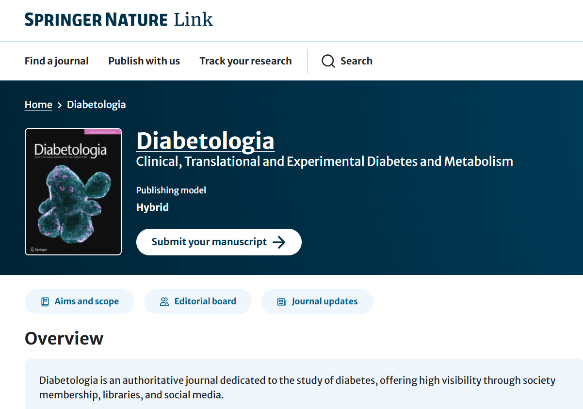 《糖尿病学》是欧洲糖尿病学会(European Association for the Study of Diabetes,EASD)的官方杂志,是一本国际著名的同行评审期刊,聚焦于糖尿病相关的基础研究、临床研究、转化医学以及治疗和预防方面的研究进展。该杂志创刊于1965年,1997年获得第一个影响因子,由国际著名出版商施普林格出版,每年发行12期,主编是来自瑞典隆德大学的Hindrik Mulder教授。目前期刊已被包括SCIE在内的众多数据库收录,ISSN:0012-186X,eISSN:1432-0428,JCR1区,中科院1区,最新影响因子8.2,五年影响因子9.1。杂志发表有关糖尿病的各类研究,包括但不限于糖尿病的病理生理、遗传学、流行病学、治疗方法、并发症管理以及糖尿病相关的代谢异常。