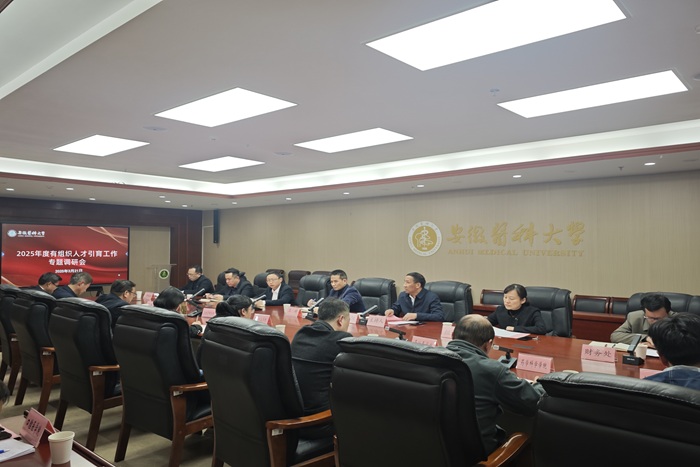 王琦就做好学校有组织的人才引育工作强调,一是聚焦重点方向。要加强引进人才与学科方向的匹配度,紧密对接健康产业需求,培养和打造医工、医文、医理等交叉复合型人才。二是聘任引才大使。校院两级要协同发力,校内校外并举,聘任一批有资源、有热情的引才大使;要完善配套奖励政策,激发活力,建强队伍,真正将以才引才工作落实落地。三是建设引才平台。要用好海外校友会、留学人员联谊会、长三角合作中心等校内平台,并与安徽欧美同学会等校外机构开展长期合作,建立紧密联系。四是组织引才活动。既要开展大规模、有声势的引才行动,又要筹划小规模专题引才活动,打造安医品牌;要结合海内外专场招聘会和学术活动,挖掘人才招引资源。五是促进人才融入。要全面提升服务意识,确保服务到位,为人才发展营造良好的发展环境,吸引并留住更多优秀人才。六是精准辅导申报。要建立辅导专家库,通过精准匹配为申报人提供一对一指导,从学校和学院两个层面加强支持,帮助其熟悉申报流程、优化材料撰写、提升答辩技巧,全面提升申报质量。七是营造引才氛围。要完善相关政策,优化网站建设,加强定期调度,做好各项保障工作。