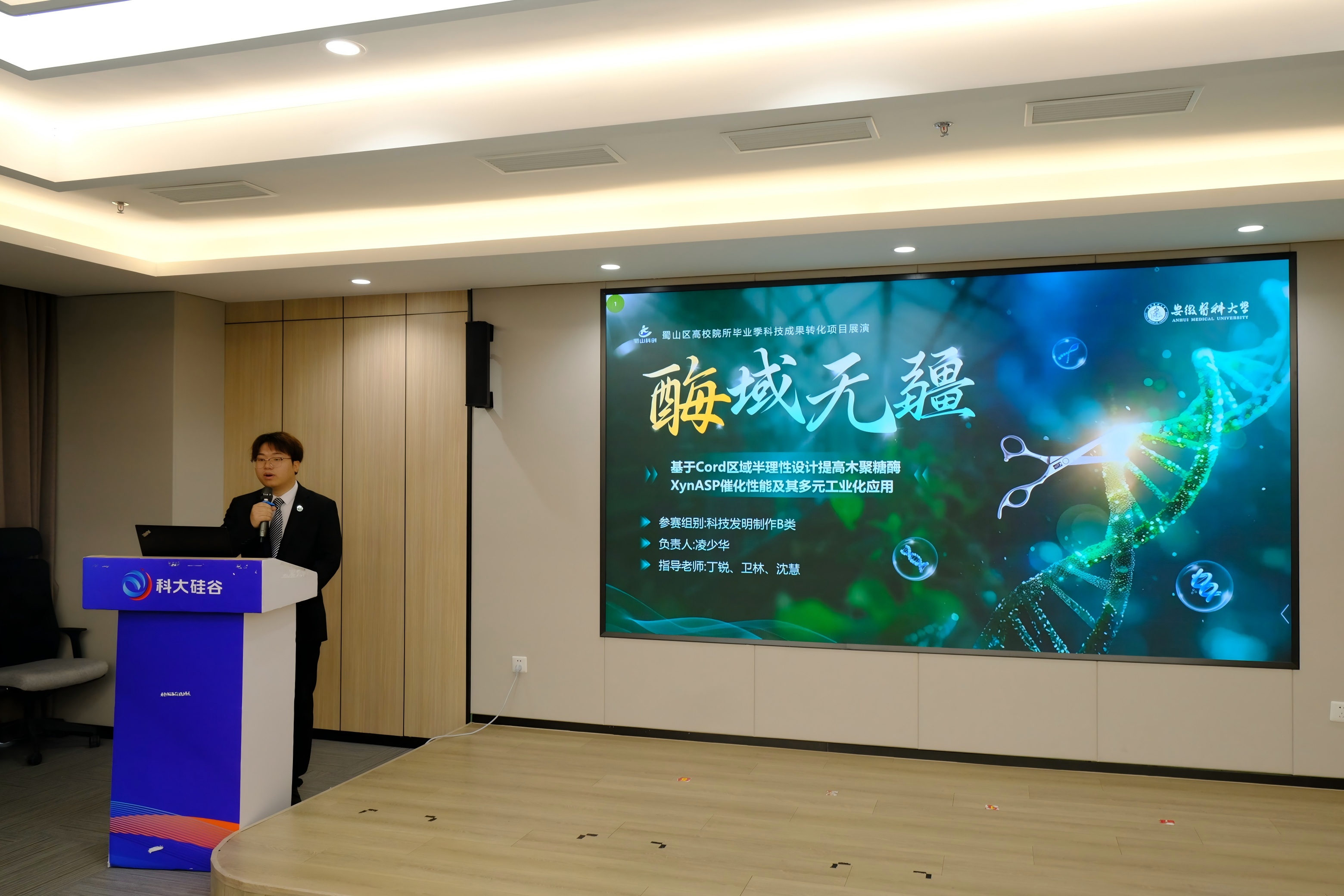 在学校科技产业部的指导帮助下,“酶域无疆”项目成功落地肥西桃花科创谷。未来,团队将依托学校新型研发机构,加速酶技术产业化应用,深耕生物催化、绿色合成等领域,推动产学研深度融合,打造具有核心竞争力的酶制剂研发与转化平台,为区域生物经济高质量发展注入强劲动能。“酶域无疆团队主要通过酶学技术创新,聚焦在生物医药生产,农业废弃物处理,食品加工等领域,为绿色生物制造赋能。”项目负责人凌少华介绍道。