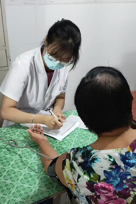 暑期“三下乡”社会实践活动中,檀秀婷顶着高温,尽心尽力地为数百名老人测量血压、血糖,提醒应对高温的注意事项,科普慢性病的日常护理知识。对于听力不好的老人,则耐心地一遍又一遍重复问题。“要对每一位信任我的爷爷、奶奶负责,要为我这身白大褂负责。”这是她心中所想,也实实在在地反映在行动上。