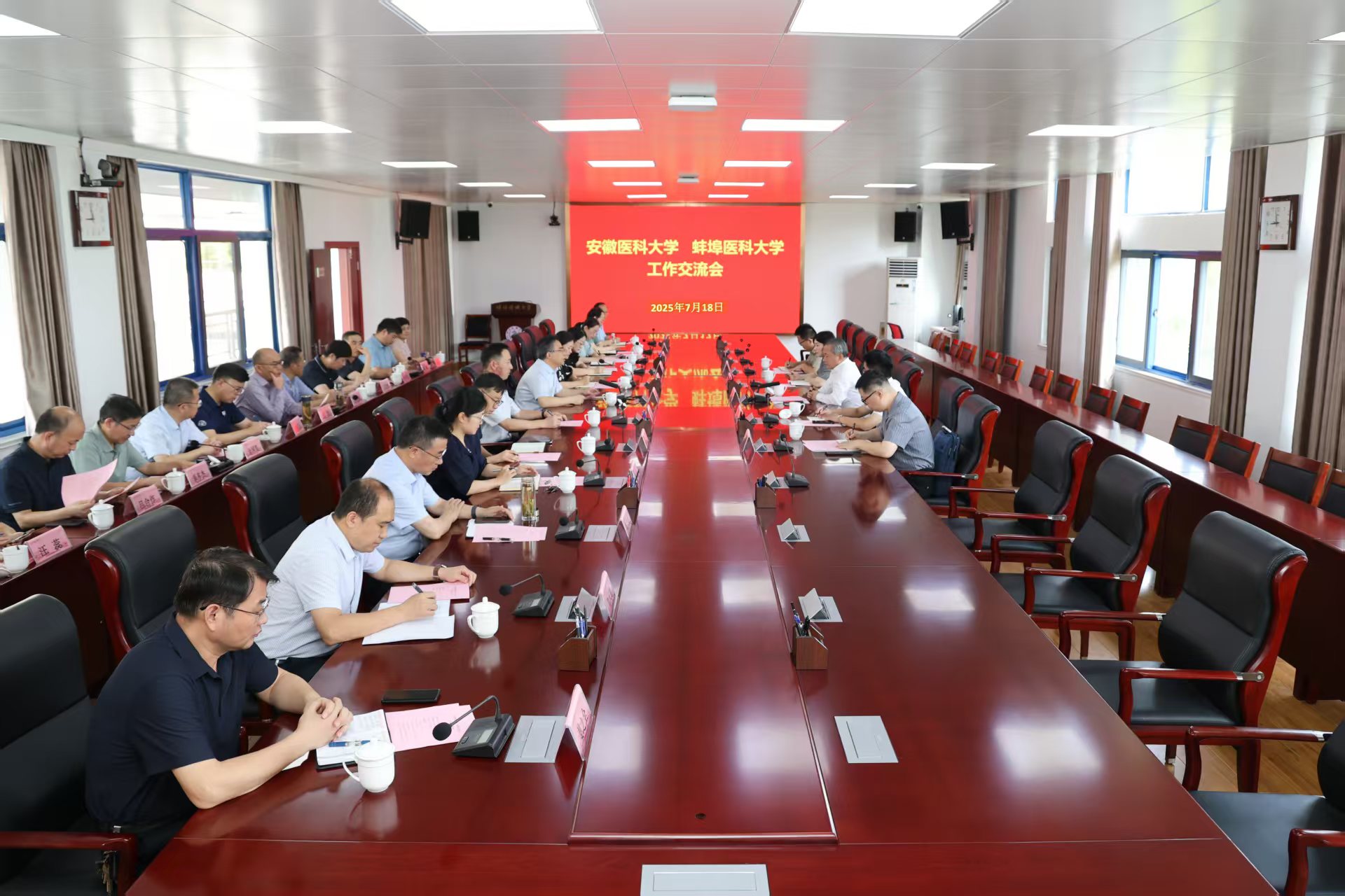 7月18日上午,校长翁建平一行赴蚌埠医科大学开展调研交流。蚌埠医科大学党委书记朱立军会见翁建平一行。蚌埠医科大学党委副书记、校长郑兰荣,校党委常委、副校长刘浩出席工作交流会。我校党委常委、副校长邱志海参加调研。