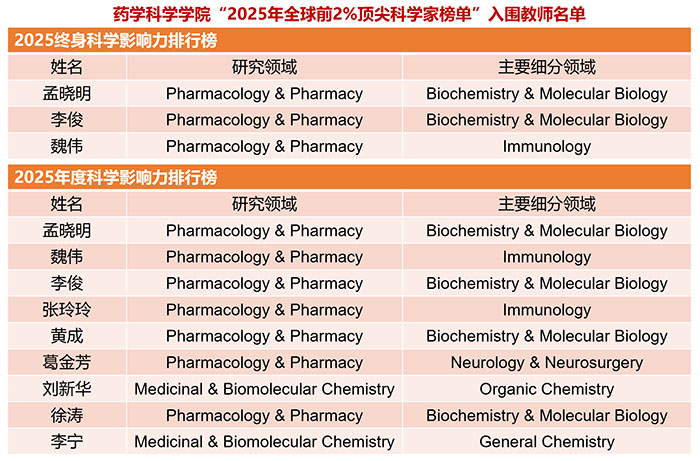 药学科学学院9位教师入选“2025年全球前2%顶尖科学家榜单”